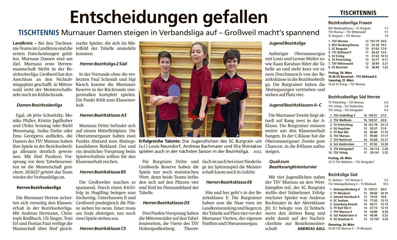 Murnau – Mit drei Tischtennisspielern ist der TSV Murnau bei den Bezirkseinzelmeisterschaften in Weilheim vertreten gewesen. Speziell eine Athletin stach heraus.